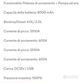 Articolo nuovo, ottimo da tenere in macchina per ogni emergenza, avviatore in caso di batteria scarica, compressore, torcia e Power bank.