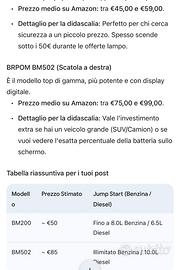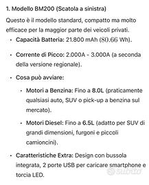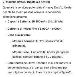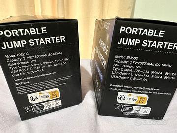 Vendi la tua auto in tutta sicurezza o affronta l'inverno senza pensieri! Propongo in vendita due modelli di avviatori d'emergenza professionali della BRPOM, compatti, potentissimi e multifunzione. Mai più a piedi con la batteria scarica: questi dispositivi avviano il motore in pochi secondi senza bisogno di un'altra auto. Entrambi i modelli fungono anche da Power Bank (per caricare smartphone/tablet) e hanno una Torcia LED integrata per le emergenze notturne. Disponibili i seguenti modelli: 1. Modello BM200 (Standard & Compatto) o Capacità: 21.800 mAh. o Potenza: Avvia motori a Benzina fino a 8.0L e Diesel fino a 6.5L. o Extra: Bussola integrata nel design e doppia porta USB. o Ideale per: Auto utilitarie, berline, SUV standard e piccoli furgoni. o Prezzo: € 35 2. Modello BM502 (Top di Gamma / Heavy Duty) o Capacità: 26.800 mAh (Potenza estrema). o Potenza: Avvia TUTTI i motori a Benzina e Diesel fino a 10.0L. o Display LCD: Indica l'esatta percentuale di carica residua. o Ideale per: Mezzi pesanti, grandi SUV, camper, barche o per chi vuole il massimo della sicurezza. o Prezzo: €45 Perché acquistarli? o Condizioni: Nuovi, mai usati (come da foto). o Sicurezza: Protezione contro cortocircuiti, inversione di polarità e sovraccarico. o Portabilità: Custodia rigida inclusa per tenerli comodamente nel bagagliaio o sotto il sedile. Contenuto della confezione: o Jump Starter BRPOM o Cavi intelligenti con morsetti o Cavo di ricarica USB-C o Custodia protettiva anti-urto o Manuale d'uso