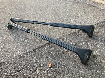 Rapido montaggio con nastro e chiusura con chiave. complete di piedi premontate pronte all’utilizzo su autovetture con barre longitudinali di tipo “integrato” (Rails Int.). Fornite di antifurto con 4 serrature a chiave. Il sistema a regolazione telescopica consente il montaggio all’interno dei mancorrenti senza sporgere dal tetto.