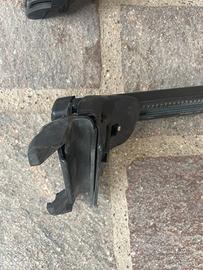 Coppia barre portatutto in acciaio complete di piedi, per auto provviste di barre longitudinali di dimensioni comprese tra 18 e 50 mm. Antifurto grazie allo speciale utensile in dotazione. Altezza piede (distanza tra la base del piede ed il punto di contatto con la barra): 8,4 cm. Portata: 100 kg. Lunghezza: 118 cm.