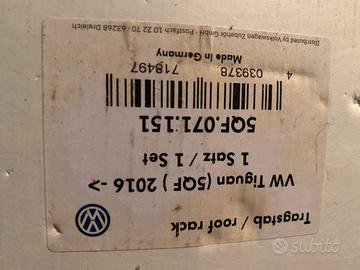Vendo barre portatutto originali VW per Tiguan seconda serie, da 2016 a 2024. Ancora in imballo originale, mai aperto. Mai usate. Valore atruale di acquisto in concessianariq o negozio 406€. Prezzo 200€ non trattabile.