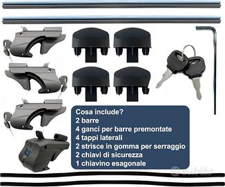 Cosa Ricevo? Coppia barre, 4 ganci con chiusura posteriore, 4 tappi chiusura, 2pz chiave di sicurezza, chiave esagonale e 2 gomme antiscivolo
