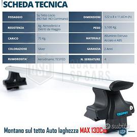 Barre Portatutto da Tetto per FORD FUSION, in ALLUMINIO Estruso | Barre Portabagagli Originali Trophybars, per Versioni Prive di Corrimano - Rail Prodotto dal Design Curato ed Eccellenza Certificata che non Pregiudica l'Estetica o la Sportività del Veicolo sul Quale Viene Installato. - Eccellenza dei Materiali ""Dettagli - Tatto"" - Aerodinamica e Resistenza Alle Intemperie Testata - Installazione FACILE - Antifurto System (Doppia Serratura a Chiave) SONO LA BASE PER IL MONTAGGIO DI: - Portabici - Box Portapacchi - Tende da Tetto - Portasci - PortaSnowboard - Portakayak - Faretti Aggiuntivi - Barre LED COMPATIBILITÀ: - Per FORD FUSION (2002-2012) INFO: Barre Portatutto di manifattura Eccellente nella qualità dei materiali, Rifiniture del Dettaglio, Tatto e Colorazione, costituiscono LA PIU' ALTA FASCIA di prodotto di questo genere, presente sul mercato. Massima Cura del Dettaglio, ogni parte di contatto all' Auto è Rivestita Completamente in Gomma Siliconica e Abs, per non Danneggiare la verniciatura e Fornire una Presa Stabile. MONTAGGIO: - Montare Le barre Portatutto come da Istruzioni - Posizionarle sul tetto con la parte a Punta rivolta verso Dietro - Far agganciare la linguetta Metallica Nera nel vano chiusura sportello - Serrare bulloncini con i chiavini forniti in Dotazione DETTAGLI TECNICI: - Applicazione: Su Tetto Auto senza Corrimano - Bloccaggio: Antifurto Lock System - N° Serrature: 2 - Materiale: Alluminio Estruso - Colore: Satinato - Finitura: Traslucida - Peso: 4,44Kg - Dimensioni: 122Cm x 2,6Cm x 8Cm - Potenziale di carico: 75Kg - Confezionamento: Box Cartone Originale - Specifiche tecniche: Alta resistenza allo Schiacciamento e Graffi PER INFO CONTATTARE AL 3927091031 ANCHE LINEA WhatsApp OPPURE VIA E-MAIL: rtautoitalia2018@libero.it CONSEGNA: - Effettuiamo Spedizioni 24-48H in TUTTA ITALIA - Ritiro in Sede - Vendiamo solo Articoli Nuovi PAGAMENTI: - PayPal - Con Carta - Bonif