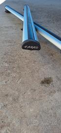 Barre portatutto Farad modello Aerodynamic in alluminio con cava a T (per portabici, box tetto ecc.). Complete di attacchi tipo BS per tetto liscio (fissaggio su bordo portiera). complete di chiave regolazione ⚠️ Il kit attacchi è specifico per alcune auto (non universale). Le barre sono invece riutilizzabili cambiando solo il kit.