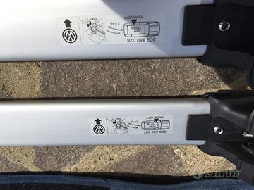 Barre portatutto Volkswagen nuove mai utilizzate complete di custodia. Ideali per Passat ma utilizzabili anche su altri modelli grazie all'escursione. Adattabili a barre longitudinali con misura compresa fra 83 e 93 cm come interasse (misura esterna).