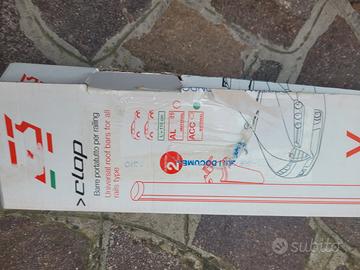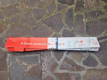 Vendo barre portatutto universali per auto con railings, marca C.L.O.P., kit completo da 2 barre. Ideali per trasporto bagagli, box da tetto, bici o altri accessori compatibili. Condizioni come da foto.