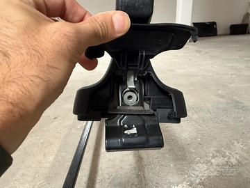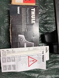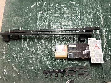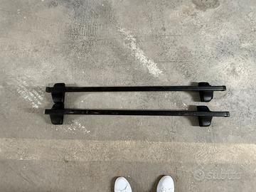 Barre portatutto per auto marca THULE. Oggetti usati ma tenuti bene, li avevo installati sopra la mia auto Alfa Romeo Giulietta, macchina priva di aste fisse longitudinali. Le barre vanno usate per le autovetture che non hanno i binari rialzati di supporto, poichè hanno dei gommini che hanno la funzione di fissarli in modo solido senza il rischio che possono staccarsi. Queste barre hanno la capacità di poter modificare la distanza del gommino di fissaggio(max 15cm).