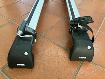 Coppia di bellissime barre Thule complete di piedini e di portabici Elite Sanremo gia’ montato, perfetto per portare 2 biciclette, anche grandi, in massima sicurezza ed altri oggetti nello spazio centrale visto che i porta biciclette sono montati agli estremi delle barre. Barre ottime con poco fruscio aerodinamico grazie al profilo alare. Thule è il produttore leader di mercato per le barre di alta qualità. Con chiave antifurto, chiave di scorta e strumento di montaggio specifico. Sicuramente montano sulla quarta serie della Mercedes Classe C Wagon (S205) 2014-2021 e sulla classe E (S213) del 2016. Monta anche su altri modelli perché la tipologia di attacco alle barre è abbastanza diffusa. Solo consegna a mano a Roma.