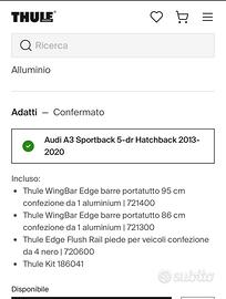 Vendo kit barre thule con adattatore per audi a3 8v dal 2013 al 2020 con profili integrati. Come da foto il kit comprende Barra 7214 usata Barra 7213 nuova Kit 7206 usato Kit 186041 nuovo Eventuale spedizione a carico dell’acquirente