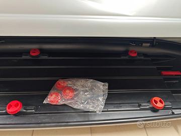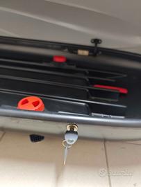 Box da portapacchi per auto da 460 l. per barre portatutto. Come nuovo, si può aprire da entrambi i lati. Ingombri di massima: 200 x 70 x h.55 circa