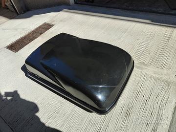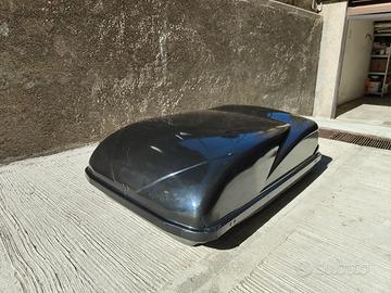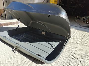 vendo Come da titolo box tetto auto G3 350 in buone condizioni con qualche ammaccatura visibile da foto, completo di ganci di montaggio e doppia chiave di chiusura.