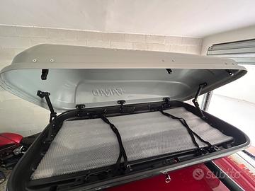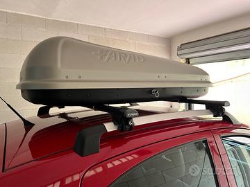 Baule da tetto per auto marca FARAD (modello non più in produzione), capacità circa 330 litri + Barre + kit di fissaggio FARAD compatibile con auto dotate di corrimano alto.