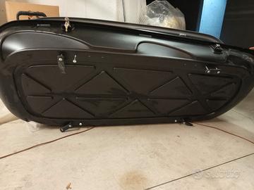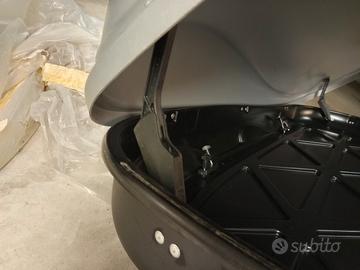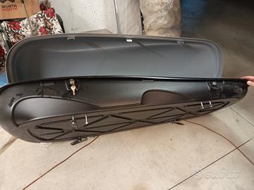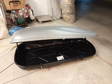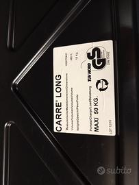 Baule per tetto auto modelloCarré Long. usato una sola volta e poi sempre riposto imballato in garage. Capacità:480 litri. Dimensioni:180x78x41 cm. Peso:15 kg. Portata massima:50 kg. Certificazioni:TUV NORD e DIN 75302 per la sicurezza.