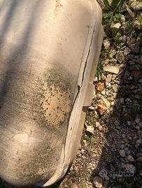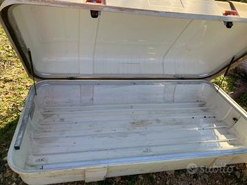 Vendo baule portapacchi usato fiamma, misure 1.90/0.70 alto 0.45, ha una piccola lesione sul fianco inferiore facilmente riparabile. E una lesione al bordo del coperchio anche questa riparabile, non prende acqua Prezzo trattabile