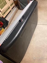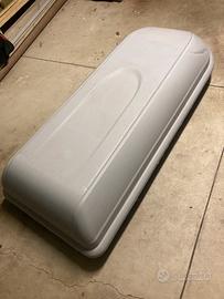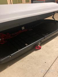 Baule per tetto auto usato poco. Serratura, fermo di sicurezza laterale e anteriore, fissaggio adattabile su barre porta tutto. Cinghie per fissaggio interno del carico. Dimensioni 185x75cm altezza max 45cm