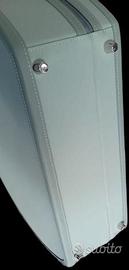 Bauletto pensato dal Centro Stile Fiat per la Fiat Topolino, colore acquamarina, molto ricercato nei dettagli con la scritta Topolino sul manico, grande scritta Fiat davanti, cerniera per apertura a libro, interno con fodera stampata con texture Fiat.