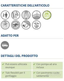 La consegna comprende: telo della tenda, 3 tubi gonfiabili ø 10 cm, 2 tubi gonfiabili ø 8 cm, 2 pali per la messa in opera, 1 palo per airlock, pompa ad aria, materiale per il fissaggio, custodia per il trasporto.
