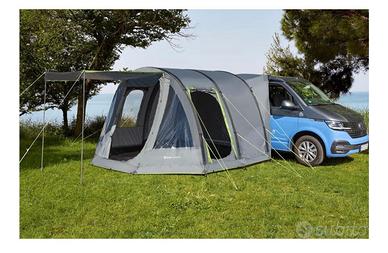 DESCRIZIONE DEL PRODOTTO Viaggiate con il vostro van e non volete perdere tempo a montare e smontare la veranda per spostarvi rapidamente da un luogo all'altro? Allora il tendalino Touring Air, gonfiabile ed indipendente, con cabina letto estensibile, è la soluzione ideale per la vostra prossima vacanza. La tenda è adatta ai veicoli con un'altezza di collegamento tra 180 e 220 cm. L'altezza complessiva è di 205 cm. Caratteristiche: L'ingresso sulla parete anteriore e l'ingresso laterale possono essere arrotolati o lasciati aperti da utilizzare come tenda da sole. Le due entrate con porta a zanzariera tengono lontane le zanzare e garantiscono una migliore circolazione dell'aria. Le finestre con pellicola trasparente possono essere chiuse in modalità opaca dall'interno sulla parete anteriore e dall'esterno sulle pareti laterali, in modo da da permettervi di trascorrere un soggiorno tranquillo nella vostra verenda. Anche il telo di fondo saldamente cucito offre maggiore comfort e protegge i mobili da campeggio dall'umidità proveniente dal basso. La parete posteriore può essere spostata lateralmente tramite una cerniera ed include una protezione antivento. Blocco di collegamento con cucitura a orlo e barra di bloccaggio. Cuciture sigillate con nastro adesivo: il nastro adesivo protegge ulteriormente tutte le cuciture e impedisce all'umidità di penetrare. Le cerniere a doppia copertura offrono un'ulteriore protezione dal vento e dalla pioggia agli ingressi e alle finestre. Il passaggio del cavo di alimentazione (E-port) consente un'alimentazione sicura con un pavimento saldamente cucito. Può essere chiusa con una cerniera. La consegna comprende: telo della tenda, 3 tubi gonfiabili ø 10 cm, 2 tubi gonfiabili ø 8 cm, 2 pali per la messa in opera, 1 palo per airlock, pompa ad aria, materiale per il fissaggio, custodia per il trasporto.
