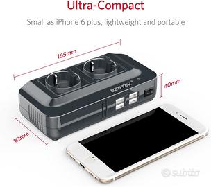 BESTEK 200W Inverter da Auto 12V a 230V con 4 Porte Smart USB 2 Prese AC, Convertitore Potenza per Auto/Camper/Barca a Onda Sinusoidale Modificata