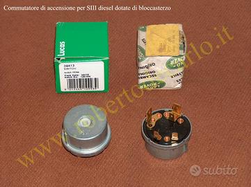 Vendo bloccasterzo completo di commutatore di accensione, nuovo, originale delle 88 e 109 SIII diesel, supporta cavo di arresto motore, codice RTC4773 (ex NRC4366, NRC4367) Euro 890,00, disponibile anche per versioni a benzina, codice RTC4772 (ex 623223, 623224) Euro 890,00. Bloccasterzo Land Rover 90-110 diesel, originale Lucas, adattabile SIII (non supporta il cavo di arresto motore che andrà posizionato diversamente), codice QRF100870 Euro 130,00, viti a strappo Euro 15,00 la coppia, collare di fissaggio Euro 20,00, commutatore di accensione di ricambio per bloccasterzo diesel, codice 579084 Euro 120,00, commutatore di ricambio per bloccasterzo benzina, codice 579085 Euro 100,00. Cavo di arresto motore guida a sinistra, codice NRC4370, Euro 65,00 aftermarket, Euro 110,00 originale, tutti ricambi nuovi, mai usati, dispongo di moltissimi altri ricambi della mia collezione che sto cedendo, contattatemi per qualsiasi esigenza.