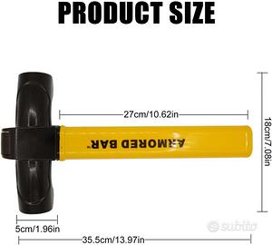 Blocco Volante Antifurto Universale per Auto, Camper, Furgone - Con 2 Chiavi, Immobilizzatore (Giallo) Blocco volante realizzato in lega di alluminio di alta qualità, robusto e durevole. Il manico è realizzato in materiale antiscivolo, ha un colore giallo, non contiene metalli pesanti oltre lo standard ed è ecologico e innocuo. Il lato esterno è liscio e non ha spigoli vivi. L'aspetto giallo brillante garantisce uno shock visivo e un maggiore livello di protezione per il veicolo. Bloccasterzo a forma di T: l'artiglio del volante ha un design a forma di T che può limitare meglio la gamma di rotazione del volante, invece di riparare il volante bloccato e causare danni irreparabili al cruscotto e al volante. Questo artiglio del volante è dotato di un avanzato cuscinetto in spugna resistente all'usura vicino alla serratura, che assicura che il volante non si graffi durante l'uso. 【Chiave di sicurezza】 L'artiglio del volante ha un robusto meccanismo di bloccaggio con chiave di sicurezza unica. Il blocco del volante a forma di T viene fornito con 2 chiavi di sicurezza che non possono essere duplicate e la coppa della serratura è praticamente infrangibile. Grazie al montaggio sul volante, il blocco del volante non è possibile per un ladro di ruotare l'auto quando la chiave è inserita. Il blocco del volante è particolarmente pratico di notte. Facile da usare: il blocco del volante viene fornito con un sistema di chiusura che può essere bloccato e sbloccato in pochi secondi con la chiave in dotazione. Grazie alla sua speciale apertura a molla, questo tappo a T è il più semplice possibile da installare. La serratura frontale garantisce un migliore accesso e una migliore visibilità quando si inserisce la chiave, che è particolarmente utile di notte. Universale: il blocco del volante è abbastanza grande da adattarsi alla maggior parte dei normali volanti, compresi quelli con airbag, e può essere utilizzato per la maggior parte delle auto, camion e roulotte.