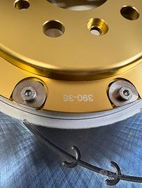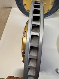 -kit anteriore maggiorato 390x36 flottante con sistema a slitta in inox (espansione fino a 2mm) , campana in ergal 7075 da 9mm , spessori in acciaio per spostare la pinza per alloggiare il disco maggiore.