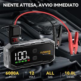 YUSMAN Booster Avviamento Auto - 6000A Portatile Avviatore di Batteria Auto per Auto/Moto 12V (fino a ALL Gas/10.0L Diesel), Avviatore di emergenza per Auto con cavo di sicurezza, LED, 5 V/3A, QC3.0 MarchioYUSMAN Dimensioni del prodotto210P x 40l x 95H mm Amperaggio6000 Picco corrente in uscita5E+3 Ampere ProduttoreYUSMAN Informazioni su questo articolo [Grande capacità Starter Batteria Auto] YUSMAN L'avviatore portatile per la batteria dotato di una corrente massima di 6000 A e una grande capacità di 21800 mAh, starter batteria auto Può essere avviato rapidamente veicoli a 12V (motore ALL gas o 10L diesel), avviatore batteria auto Adatto per auto, camion, motociclette, moto d'acqua, tosaerba, yacht, pick-up, motoslitte, ecc. avviatore auto Funziona in modo sicuro anche in ambienti estremi (-20℃~+60℃), quindi non dovrete più preoccuparvi di scaricare la batteria dell'auto nel freddo inverno o nel caldo estivo. [Banca di Energia Portatiled e Schermo a LCD] YUSMAN Non è solo un booster auto, ma anche una portatile Banca di potenza compatta di grande capacità, 21800mAh in grado di caricare facilmente telefoni, tablet o altri dispositivi,Dotato di una porta di uscita USB da 5 V/3A, QC3.0.starter batteria auto per schermo LCD mostra la potenza rimanente e lo stato operativo dell'avviatore di avviamento. [LED Illuminazione] YUSMAN Torcia a LED incorporata, con 4 modalità:Illuminazione/Attenzione/SOS/Strobe, molto adatta per campeggio, esterno, interno, emergenza, viaggi, ecc. booster avviamento auto lo strumento ideale per l'uso quotidiano, viaggi, gite all'aperto, situazioni di emergenza.Inoltre, starter auto portatile sue dimensioni sono molto ridotte, quindi è facile da trasportare o da mettere in valigia. [Morsetto di Sicurezza ] YUSMAN l'avviamento della batteria portatile ha 8 funzioni intelligenti di protezione dell'aggiornamento integrate (protezione da inversione di polarità, protezione da connessione inversa, protezione d