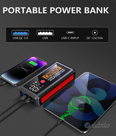 【NON SOLO UN AVVIATORE】CARHEV Avviatore Batteria Auto funge anche da power bank da 26800mAh con 2 uscite USB (9V/2A e 5V/2A), carica rapidamente dispositivi USB come telefoni, tablet, cuffie e molto altro. Torcia a LED incorporata con 3 modalità: Flash, Strobo e SOS. Inoltre, il booster per auto dispone di una porta di uscita da 12V/10A per alimentare dispositivi a 12V CC, come compressori d'aria portatili.