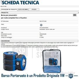 SET 4 Borse Porta Pneumatici fino a 18'' ORIGINALI VOLKSWAGEN con LOGO | Copriruote Professionali Massima Resistenza Contro Polveri, Umidità, Luce e Temperature E' un Prodotto Professionale ORIGINALE VW Che Rappresenta IL MASSIMO Livello in Termini di Stoccaggio Gomme utile nel cambio stagionale, e per il Trasporto. - Estetica di Impatto VW | Logo Volkswagen Stampato su ogni borsa - Protezione Professionale | Assicura uno Stoccaggio Ottimale delle Ruote in Garage o Cantina - Facile Individuazione delle Ruote | Lato e Posizionamento Ruota Contrassegnato da una stampa su ogni Borsa - Multiuso Intelligente | Tasche esterne per la Conservazione dei Perni - Trasporto Intelligente | Pratica e Robusta maniglia rende Facile e comodo il Trasporto COMPATIBILITÀ: - Vetture Volkswagen con Ruote comprese tra i 14 Pollici e 18 Pollici - Larghezza Pneumatico Non Superiore a 245 - VW ID.BUZZ - VW TOURAN - VW GOLF - VW JETTA - VW CADDY - VW T-ROC - VW T-CROSS - VW BEETLE - VW PASSAT - VW ID.5 - VW ID.4 - VW ID.3 - VW MAGGIOLINO - VW UP - VW TOUAREG - VW TIGUAN - VW TAIGO - VW SCIROCCO - VW POLO - VW SHARAN - VW AMAROK SCHEDA TECNICA: - Materiale Esterno: Poliestere di Qualità - Colore: Nero, Blu - Grado di Aderenza: Elevata - Logo: SI - Protezione Luce: SI - Protezione Umidità: SI - Protezione Temperatura: SI - Antistatico: SI - Utilizzo: Interno - Lunghezza Tot: 2100 mm - Peso: 1,5 Kg - Spessore: 2 mm PER INFO CONTATTARE AL 3927091031 ANCHE LINEA WhatsApp OPPURE VIA E-MAIL: rtautoitalia2018@libero.it CONSEGNA: - Effettuiamo Spedizioni 24-48H in TUTTA ITALIA - Ritiro in Sede con Possibilità di Visionare il Prodotto - Vendiamo solo Articoli Nuovi PAGAMENTI: - PayPal - Con Carta - Bonifico Bancario - Alla Consegna con Contrassegno