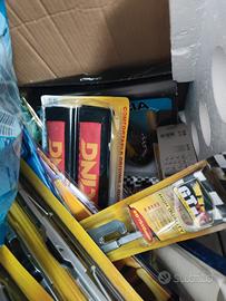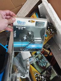 box con oltre 85 pezzi accessori auto moto bici pomelli cambio, terminali scarico copri cinture spazzole tergi luci parasole, calze da neve pedaliere grafiche pelli ecc...