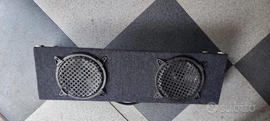vendo per inutilizzo box audio con due woofer 2 twiter 2 crossower ,come da foto ,preferibile ritiro a mano per dimensione oggetto che risuklta come da foto lungo 77 cm profondo 20 cm