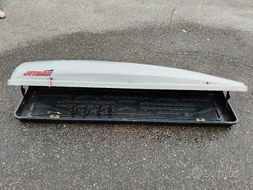 Vendo box portatutto da tetto Jetbag, prodotto di alta qualità (linea Thule), ideale per aumentare la capacità di carico della tua auto per vacanze, sci o campeggio. lunghezza:225 cm larghezza: 55cm altezza: 35cm Serratura funzionante con chiave originale inclusa e kit completo di cavallotti a U per il fissaggio alle barre portatutto.
