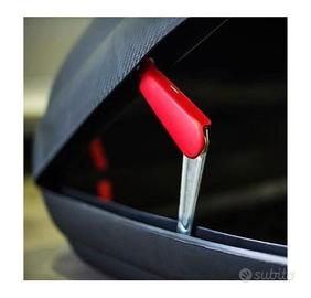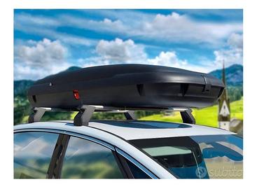 box baule per auto usato solo una volta indicato per station wagon, suv o monovolume Specifiche tecniche: Portata: 75 kg Capacità: 480 lt. Predisposto per interassi da 495 mm a 855 mm Materiale: polipropilene Non assorbe odori Non trattiene umidità Chiusura di sicurezza anteriore Effetto carbonio ad alta definizione Supporti in acciaio al 100% Sollevatori a molla Certificazione TÜV-SÜD Dimensioni: Lunghezza: 2005 mm Profondità: 790 mm Altezza: 380 mm