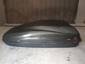 Box tetto modello G3 Helios 400 (330lt) dimensioni 1440x860x375 molto capiente buone condizioni, perfettamente funzionante, con due serrature e due chiavi, si apre su entrambi i lati lunghi.