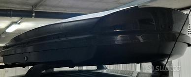Vendo Box da tetto, usato poco, 550 L., colore nero. Profilo aerodinamico con altezza ribassata (29 centimetri), apertura destra e sinistra, chiusura a chiave (fornito con le due chiavi originali). Misure: Lunghezza 171 cm - Altezza 29 cm, - Larghezza 80 cm. Ancora presente la pellicola protettiva esterna. Causa inutilizzo e cambio veicolo vendo. Perfetto per barre porta-tutto orizzontali. Visionabile e ritirabile a Mori (Trento).