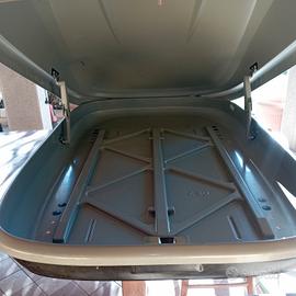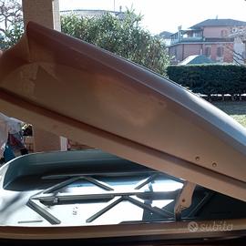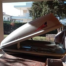 Box da tetto auto da 320 . usato pochissimo . Presenta solo leggera scoloritura sul lato come da foto . Disponibili anche agganci e barre se necessitano .