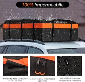 Box da tetto auto morbido e pieghevole progettato per offrire una soluzione capiente, resistente e sicura per il trasporto di bagagli e attrezzatura. Realizzato in materiale tecnico ultradenso di alta qualità, è completamente impermeabile e dotato di zip a tenuta stagna, pensate per proteggere il contenuto da pioggia intensa, neve, vento e sporco durante qualsiasi spostamento.