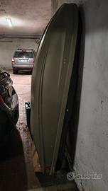 In ottimo stato, completo di 2 serie di attacchi universali per qualsiasi larghezza di barra portatutto apertura lato destro, doppie chiavi nessun danno all'involucro, nessun segno è stato applicato un rinforzo di alluminio a una delle cerniere (si vede in foto) perché un rivetto si era allentato.