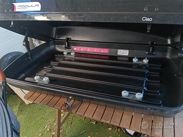Usato 4/5 volte ma in ottime condizioni Caratteristiche Altezza 45 cm Lunghezza 140 cm Larghezza 80 cm Portata 75 kg Il box da tetto per auto Modula 340 litri nero è appositamente studiato per esigenze di carico medio/alte. Dinamico e di facile utilizzo è adatto per le famiglie che desiderano muoversi in totale libertà. La sua linea deriva dall'estetica elaborata del Modula Travel, risultando da subito sorprendente piacevole nel design, pratico, capiente e dotato di grande capienza grazie alla maggiore larghezza della base. Beluga Easy è un prodotto di alta qualità, curato nei dettagli, preciso nelle lavorazioni e nelle finiture. Ogni box è costruito e gestito singolarmente grazie alle capacità aziendali dal carattere artigianale abbinate a tecnologiche industriali all’avanguardia. Per la costruzione della scocca sono stati utilizzati prodotti speciali stampati in termoformatura e materiali innovativi totalmente antigraffio resistenti ai raggi UV e adatti ad utilizzi estremi in tutte le condizioni climatiche e meteorologiche. Modula Case System ha testato i propri bauli presso il centro TÜV di Helmond in Olanda.