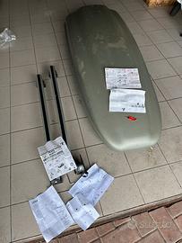 Vendo box da tetto marca G3 con ancora le istruzioni di montaggio, le viti e i perni di ancoraggio in ottimo stato e le doppie chiavi. Utilizzato solo d’estate e il resto dell’anno custodito meticolosamente nel garage. Compreso nel prezzo due barre portapacchi, marca LA PREALPINA, anch’esse utilizzate solo d’estate e poi conservate meticolosamente nel garage. Anche le barre portapacchi sono comprese delle istruzioni, due chiavi per sbloccare i coperchi di sicurezza e chiave per le viti che regolano sia la larghezza che il fissaggio al tetto della macchina. Vendo per cambio auto e non più utilizzabile. Se interessati contattatemi in privato, prezzo trattabile.