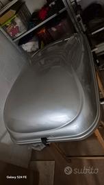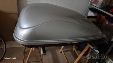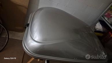 Box per auto da 350l in plastica abs impermeabile. Colore grigio argento con base nera. Con serratura sicura. Aerodinamico. Si adatta a tutte le barre da tetto.
