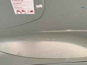 La parte da agganciare all’automobile e’ integra, mentre nel tettuccio vi sono 2 crepe ( procurate da noi per schiacciamento) ma che non incidono sulla sicurezza dell’oggetto perche’ collaudato in diversi viaggi . Facilmente montabile su barre.