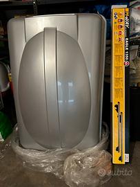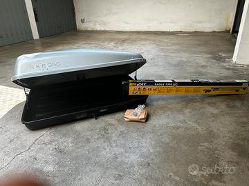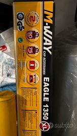 Box auto portabagagli MCS FREE 350 con barre portapacchi M-Way Eagle 1350 XL. Usato 15 giorni. Kit di sicurezza per fissaggio. Ritiro a vostro carico. BOX MELCHIONI MODELLO 350 Box portatutto capacità 350 lt Lunghezza: cm 134 Larghezza: cm 87 Altezza: cm 37 Colore grigio metallizzato Peso netto: Kg 9 Peso lordo: Kg 11 Carico max: Kg 50 Materiale: ABS+PMM Apertura: Laterale Sollevatore a molla: Compasso metallico Serratura centralizzata con chiave Cinghie di fissaggio: SI Sistema di fissaggio alla barra: Barre con sez fino a 60 mm