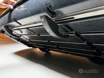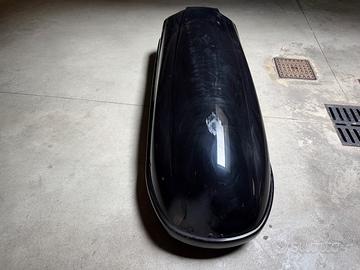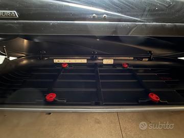 Box auto con apertura sui due lati. Kit montaggio incluso per barre con larghezza massima 100mm e altezza massima 50mm (altezza minima 20mm). Massima capacità di carico 75kg. Barre portatutto non incluse. E’ presente una graffiatura nella parte anteriore del cassone.