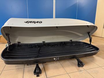 Box Portatutto FARAD N6 Capienza 480 L Dimensioni (circa): 190 x 80 x 40 Apertura su entrambi i lati con sollevatori Cinghie interne per blocco bagagli Adattabile a qualsiasi barra con sistema di aggancio e rapido Barre da canalette laterali omaggio
