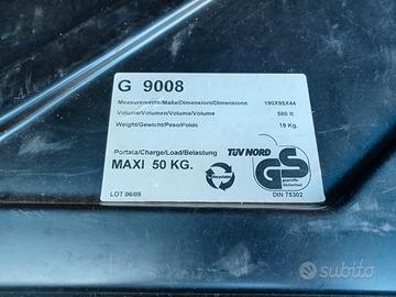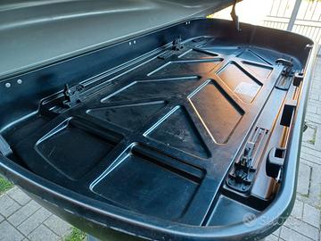 Box nero GEV 580lt. Completo di chiusura manuale frontale più chiave a mezzeria. Ancorabile all auto con 2 tipi di barre portatutto in dotazione. Sia applicabili a portiera (usato per VW Golf), sia su barre esistenti sull auto (usato per Nissan XTrail). Una coppia di barre è allungabile. Kit di montaggio completo. Usato veramente 6 volte!! (per spedizione, costi da stabilire in base alla destinazione)