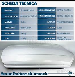 Vendo box tetto auto utilizzato solo per circa 2 settimane, privo di difetti e usura, come nuovo, corredato di accessori. Il prodotto è visivile e ritirabile a Lissone(MB). Di seguito le caratteristiche del prodotto: Box Tetto Auto da 450Lt Bianco Lucido, Baule Portapacchi ULTRA Aerodinamico | Chiusura a Doppia Serratura e Apertura su Entrambi i Lati, in Polipropilene - Capienza: 450Lt - Potenziale di Carico: 100 Kg - Dimensioni Esterne: 182,5 Cm x 80 Cm x h 30 Cm - Dimensioni Utili Interne: 152 Cm x 73 Cm x h 30 Cm Prodotto dal Design Curato che non Pregiudica l'Estetica o la Sportività del Veicolo sul Quale Viene Installato. - DESIGN Moderno Estremamente Aerodinamico, Liscio, Studiato per non Offrire resistenza al Vento - MATERIALI d' Eccellenza per una Massima Resistenza Alle Intemperie e un Potenziale di Carico Elevato. - APERTURA Doppia Laterale Ampia per un Elevata Facilità di Carico, Assistita dai Sollevatori a Molla. - ANTIFURTO System (Doppia Chiusura a Chiave + Installazione dall'Interno).