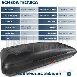 Baule, Box Tetto Auto d'Eccellenza 480LT | Effetto Fibra di Carbonio, Omologato e Certificato TÜV (Ente di controllo Tedesco) | MADE IN ITALY Dimensioni 200Cm x 79Cm x 38Cm