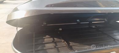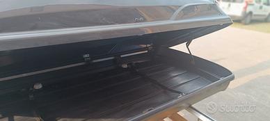 Box tetto auto Adamantis 550 Dual Side, usato poco, tenuto bene. Doppia appertura sia a dx che a sx, chiusura con chiave. Misure e peso come da foto. Ritiro diretto in loco.