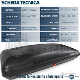 Baule, Box Tetto Auto d' Eccellenza 480LT, Effetto Fibra di Carbonio, Omologato e Certificato TÜV (Ente di controllo Tedesco), MADE IN ITALY Prodotto dal Design Curato che non Pregiudica l'Estetica o la Sportività del Veicolo sul Quale Viene Installato. - Certificazioni di Qualità e sicurezza TÜV - Eccellenza dei Materiali ""Dettagli/Tatto"" - Aerodinamica e Resistenza Alle Intemperie Testata - Facilità di Carico Laterale assistita (Sollevatori a Molla) - Antifurto System (Chiusura a Chiave + Installazione dall'interno) - Installazione FACILE INFO: Prodotto TOP di GAMMA di Qualità Eccellente nella Scelta dei Materiali, Rifiniture del Dettaglio, Tatto e Colorazione, Completamente MADE IN ITALY. La sua ECCELLENZA è CERTIFICATA TÜV-GS, in Quanto Rispetta gli Standard Qualitativi Tedeschi e Requisiti Europei. COMPATIBILITÀ: - Tutti i Veicoli con Barre Portatutto già Installate - ALFA ROMEO - AUDI - BMW - CITROEN - DACIA - FIAT - FORD - HONDA - HYUNDAI - INFINITI - JEEP - KIA - LANCIA - LAND ROVER - MAZDA - MERCEDES - MITSUBISHI - MINI - NISSAN - OPEL - PEUGEOT - PORSCHE - RENAULT - SEAT - SKODA - SUZUKI - VOLKSWAGEN - VOLVO DETTAGLI TECNICI: - Materiale: Polipropilene a Iniezione - Colore: Carbonio Nero - Finitura: Traslucida - Peso: 19,3Kg - Dimensioni: 200Cm x 79Cm x 38Cm - Potenziale di carico: 75Kg - Capienza di Carico: 480Lt - Confezionamento: Box Cartone Originale - Resistenza Schiacciamento: 55Kg - Certificazioni e Omologazioni: TÜV PER INFO CONTATTARE AL 3927091031 ANCHE LINEA WhatsApp OPPURE VIA E-MAIL: rtautoitalia2018@libero.it CONSEGNA: - Effettuiamo Spedizioni 24-48H in TUTTA ITALIA - Ritiro in Sede con possibilità di visionare il Prodotto - Vendiamo solo Articoli Nuovi PAGAMENTI: - PayPal - Con Carta - Bonifico Bancario - Alla Consegna con Contrassegno